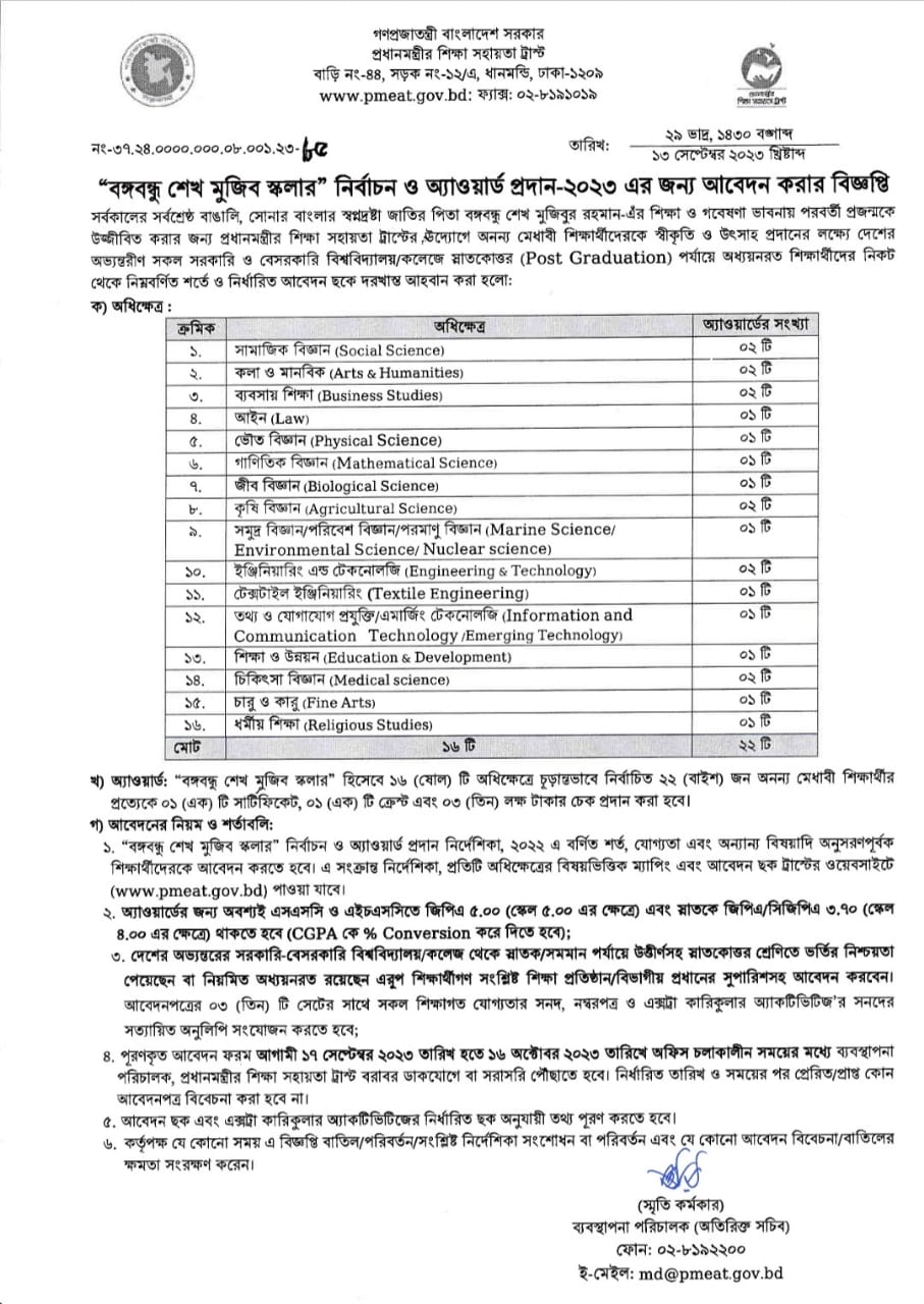 "বঙ্গবন্ধু শেখ মুজিব স্কলার " নির্বাচন ও অ্যায়ার্ড প্রদান-২০২৩ এর জন্য আবেদন করার বিজ্ঞপ্তি।