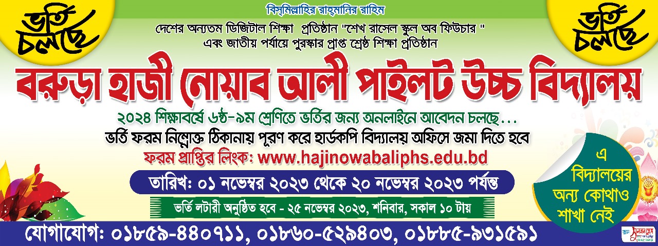 বরুড়া হাজী নোয়াব আলী পাইলট উচ্চ বিদ্যালয়ে আপনাকে স্বাগতম। বিদ্যালয়ের বিভিন্ন তথ্য পেতে বিদ্যালয়ের ওয়েবসাইট এবং ফেইজবুক পেইজে চোখ রাখুন।